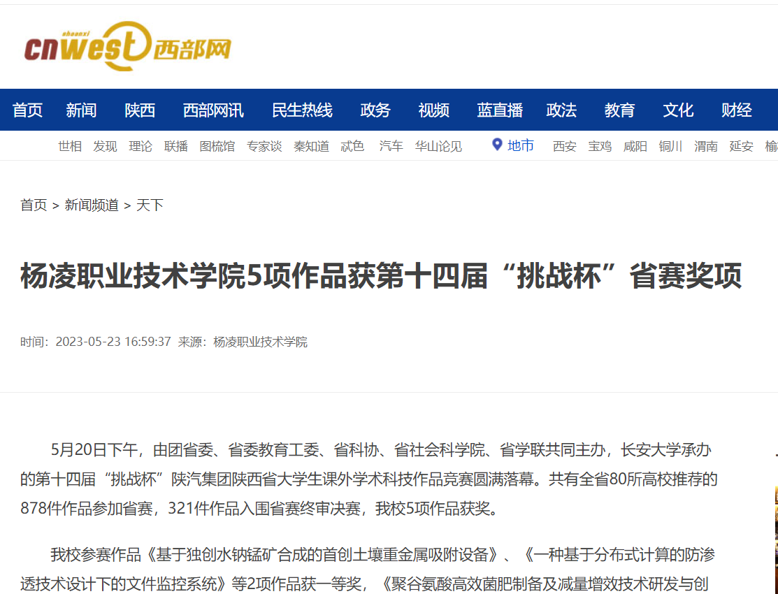 5月20日下午,由团省委、省委教育工委、省科协、省社会科学院、省学联共同主办,长安大学承办的第十四届“挑战杯”陕汽集团陕西省大学生课外学术科技作品竞赛圆满落幕。共有全省80所高校推荐的878件作品参加省赛,321件作品入围省赛终审决赛,我校5项作品获奖。