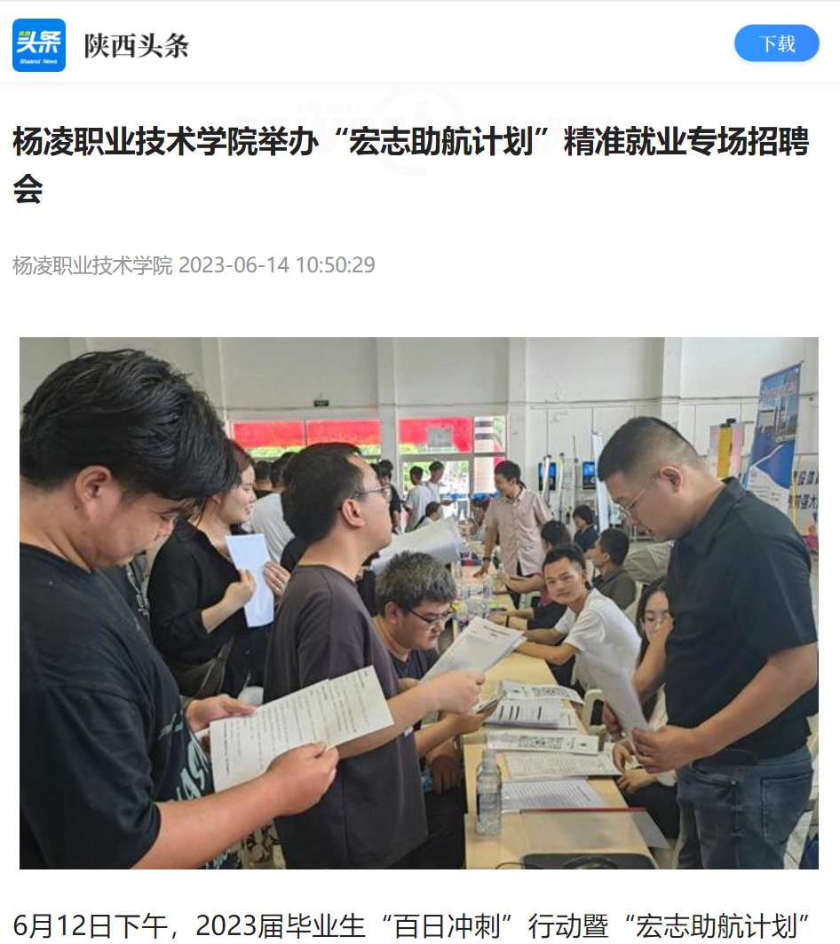 6月12日下午,2023届毕业生“百日冲刺”行动暨“宏志助航计划”精准就业专场招聘会在杨凌职业技术学院南校区举行,共有1200余名毕业生参加招聘会,450多名毕业生与用人单位达成就业意向。
