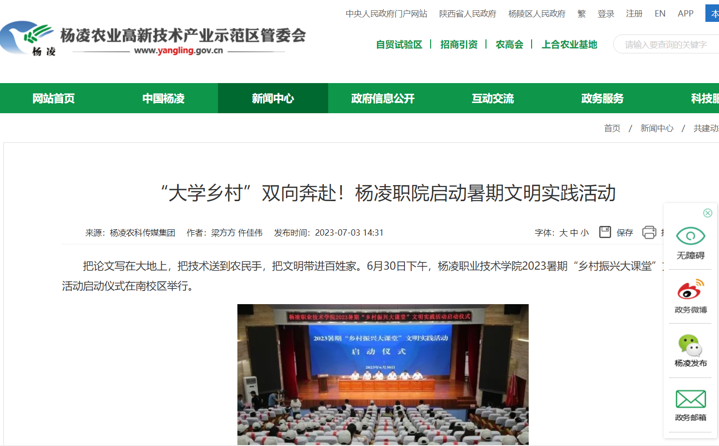 把论文写在大地上,把技术送到农民手,把文明带进百姓家。6月30日下午,杨凌职业技术学院2023暑期“乡村振兴大课堂”文明实践活动启动仪式在南校区举行。
