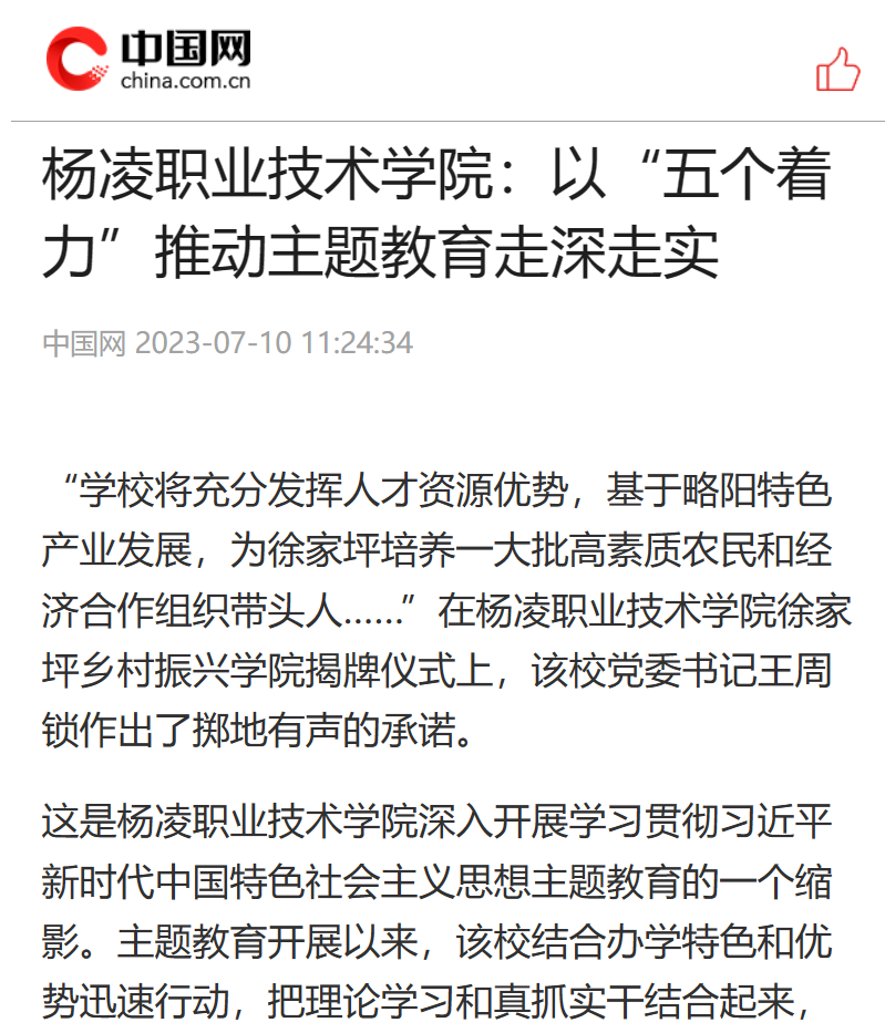 这是杨凌职业技术学院深入开展学习贯彻习近平新时代中国特色社会主义思想主题教育的一个缩影。主题教育开展以来,该校结合办学特色和优势迅速行动,把理论学习和真抓实干结合起来,推出了一系列有声有色、出新出彩的活动,主题教育成果正逐步转化为全校上下奋力建设“中国特色、世界一流职业大学”的强大力量。