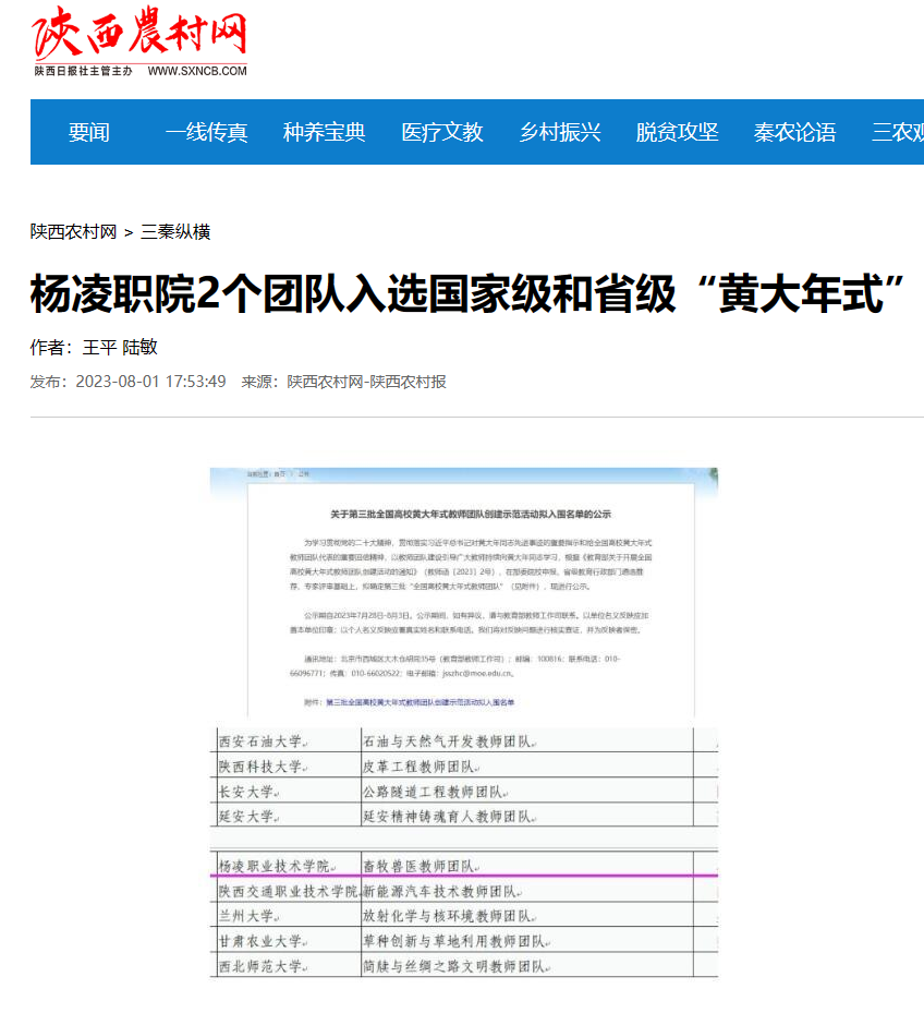 近日,教育部和陕西省教育厅发布《关于第三批全国高校黄大年式教师团队创建示范活动拟入围名单的公示》《关于公布第二批陕西省高校黄大年式教师团队的通知》,杨凌职业技术学院畜牧兽医教师团队入选第三批全国高校黄大年式教师团队,现代农业技术教师团队入选第二批陕西省黄大年式教师团队。