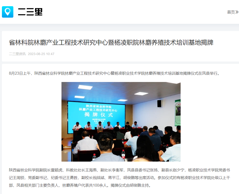陕西省林业科学院林麝产业工程技术研究中心由杨凌职业技术学院牛华锋牵头申报,研究中心和培训基地的揭牌,必将为凤县乃至全国林麝特色产业发展提供科技支撑和人才保障,推动了凤县林麝产业健康有序发展,在促进校地共同发展、互利共赢上开花结果。