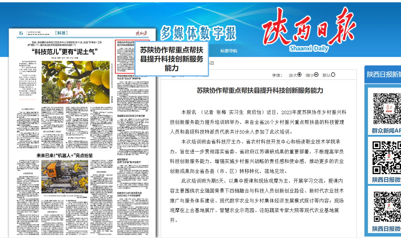 本报讯 (记者 张梅 实习生 房欣怡)近日,2023年度苏陕协作乡村振兴科技创新服务能力提升培训班举办,来自全省26个乡村振兴重点帮扶县的科技管理人员和县级科技特派员代表共计50余人参加了此次培训。