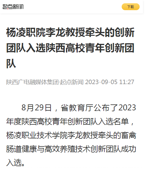 8月29日,省教育厅公布了2023年度陕西高校青年创新团队入选名单,杨凌职业技术学院李龙教授牵头的畜禽肠道健康与高效养殖技术创新团队成功入选。