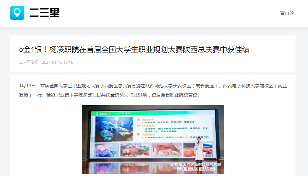 1月13日,首届全国大学生职业规划大赛陕西赛区总决赛分别在陕西师范大学长安校区(成长赛道)、西安电子科技大学南校区(就业赛道)举行。杨凌职业技术学院参赛项目共获金奖5项、银奖1项,位居全省职业院校首位。