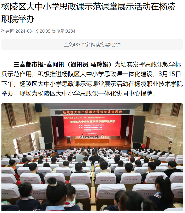 三秦都市报-秦闻讯(通讯员 马玲娟)为切实发挥思政课教学标兵示范作用,积极推进杨陵区大中小学思政课一体化建设,3月15日下午,杨陵区大中小学思政课示范课堂展示活动在杨凌职业技术学院举办。现场为杨陵区大中小学思政课一体化协同中心揭牌。