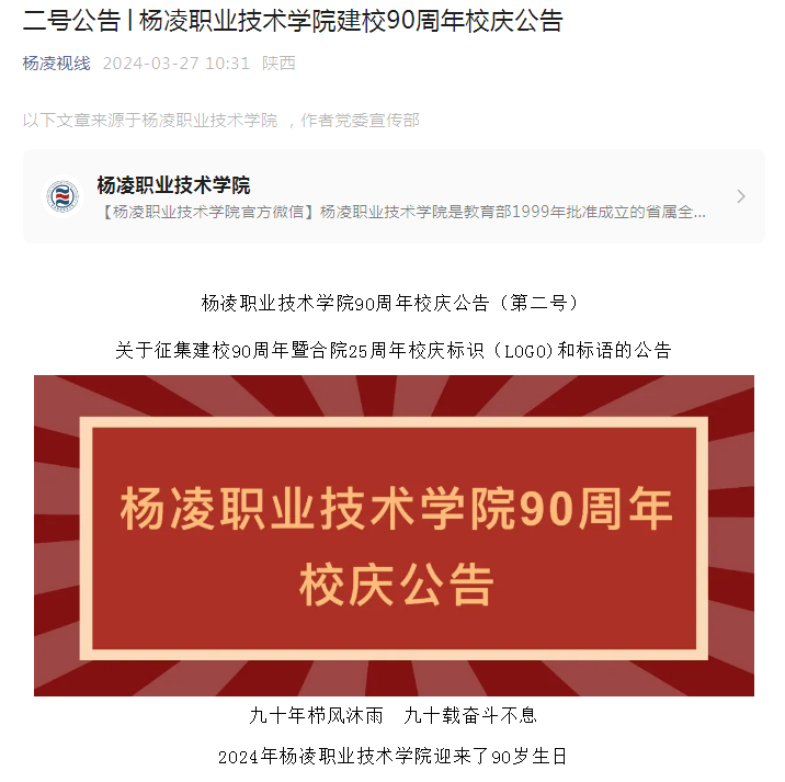 九十年栉风沐雨,九十载奋斗不息,2024年杨凌职业技术学院迎来了90岁生日,为办好系列活动,展现学校精神和历史底蕴,现面向校内外公开征集建校90周年暨合院25周年校庆标识(LOGO)和标语作品。