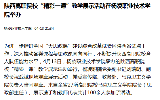 为进一步推进全国“大思政课”建设综合改革试验区陕西省试点工作,深入推动各类课程与思政课同向同行,不断提升陕西高职院校育人队伍能力水平,4月13日,杨凌职业技术学院承办的陕西高职院校“精彩一课”教学展示活动举行。杨凌职院党委副书记刘瑞明、副校长祝战斌现场观摩展示活动,党委宣传部、教务处、马克思主义学院负责人陪同观摩。来自全省27所高职院校马克思主义学院院长(思政部主任)、展示选手和教师代表共计100余人参加了活动。