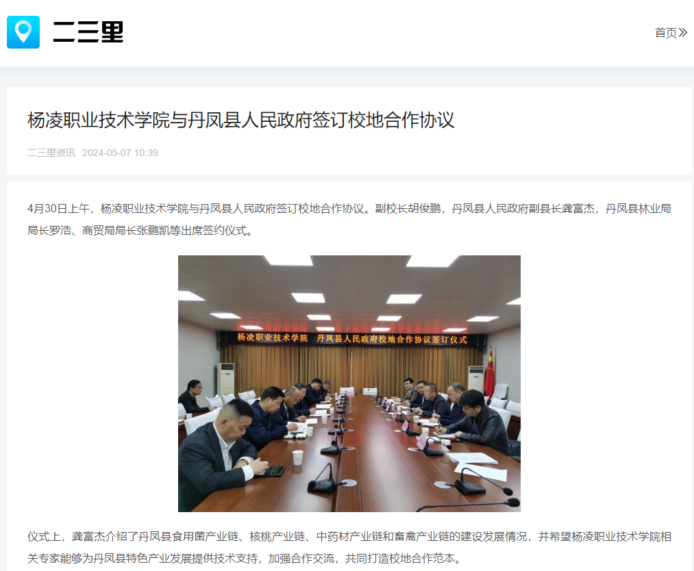 4月30日上午,杨凌职业技术学院与丹凤县人民政府签订校地合作协议。副校长胡俊鹏,丹凤县人民政府副县长龚富杰,丹凤县林业局局长罗浩、商贸局局长张鹏凯等出席签约仪式。