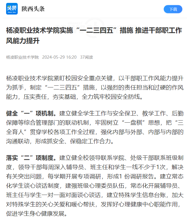 “一二三四五”措施是杨凌职业技术学院持续落实全省“三个年”活动,进一步深化干部作风能力建设、强化学生教育管理、提高育人质效的一项重要举措。该措施自本学期实施以来,全体校领导、处级干部能够积极发挥在学生教育管理中的带动作用,下沉一线主动联系师生、解决问题;辅导员每天上午7:50-8:30在学生公寓开展工作,班主任每周深入学生公寓2次以上,辅导员、班主任与学生谈心谈话1.4万余人次,形成了辅导员和班主任自觉入住学生公寓、全面了解学生生活情况和心理状况的常态化机制;广大学生能够严格遵守校规校纪,养成良好的行为习惯,提高自我约束能力,打造了清净的校风、清正的教风、清新的学风,更筑起了校园安全防线。