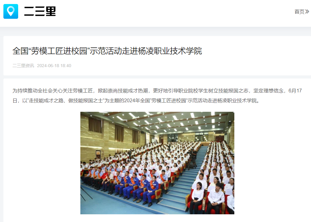 为持续推动全社会关心关注劳模工匠,掀起崇尚技能成才热潮,更好地引导职业院校学生树立技能报国之志,坚定理想信念,6月17日,以“走技能成才之路、做技能报国之士”为主题的2024年全国“劳模工匠进校园”示范活动走进杨凌职业技术学院。