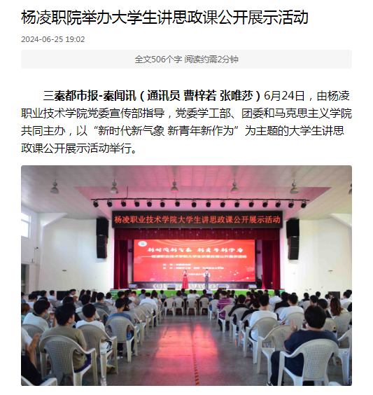 6月24日,由杨凌职业技术学院党委宣传部指导,党委学工部、团委和马克思主义学院共同主办,以“新时代新气象 新青年新作为”为主题的大学生讲思政课公开展示活动举行。
