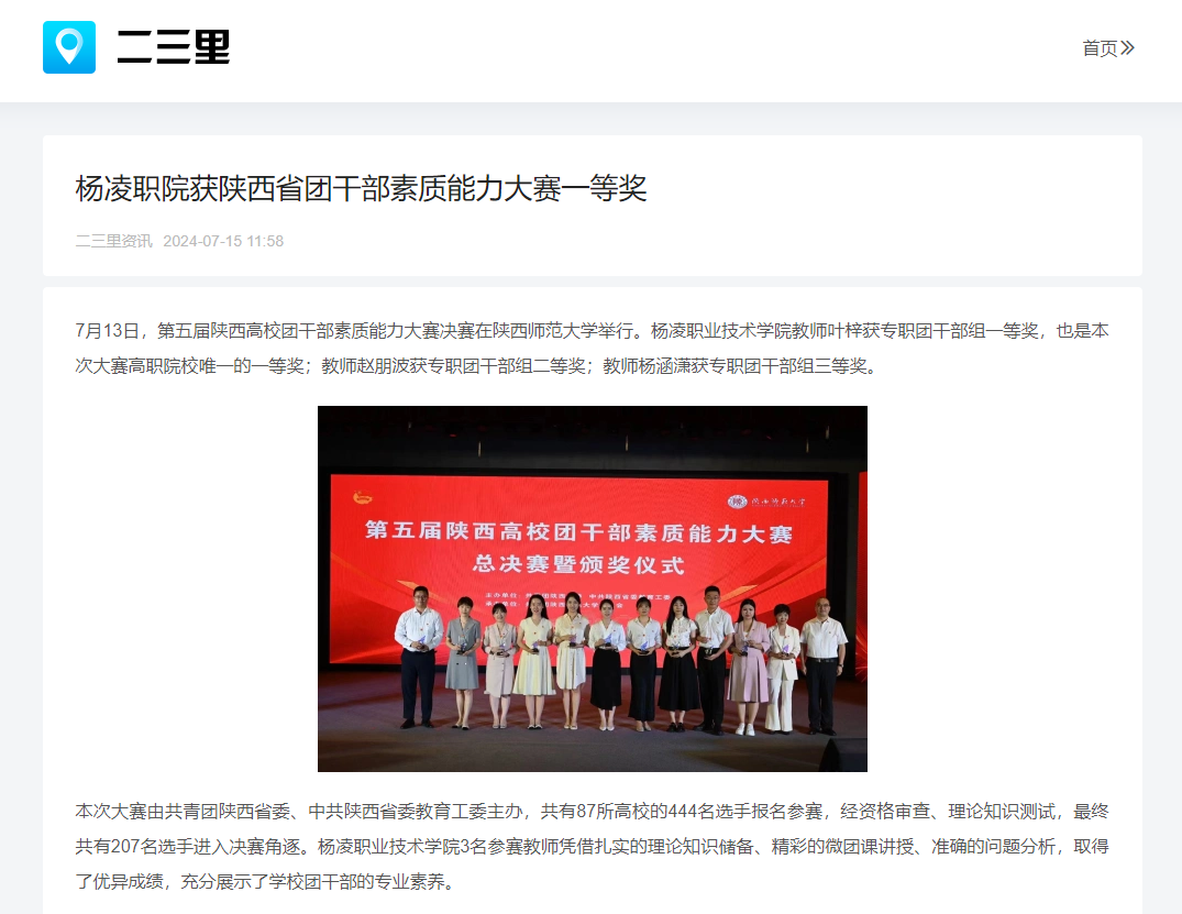 7月13日,第五届陕西高校团干部素质能力大赛决赛在陕西师范大学举行。杨凌职业技术学院教师叶梓获专职团干部组一等奖,也是本次大赛高职院校唯一的一等奖;教师赵朋波获专职团干部组二等奖;教师杨涵潇获专职团干部组三等奖。