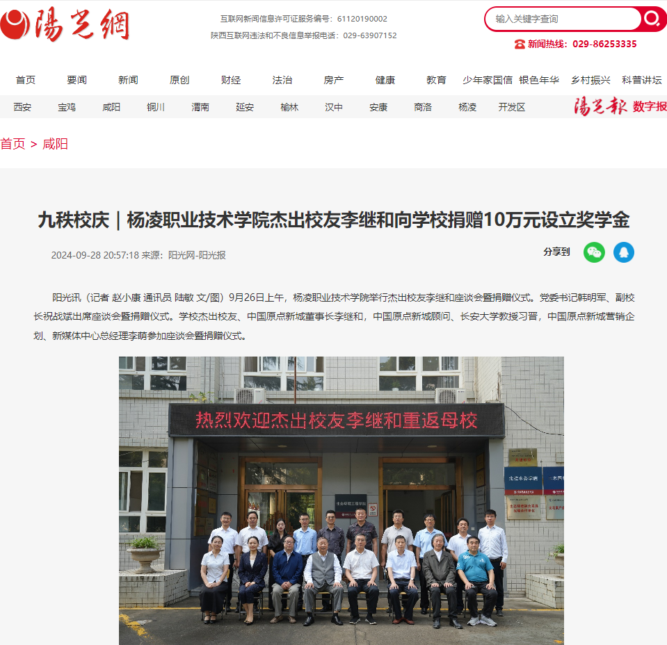 阳光讯(记者 赵小康 通讯员 陆敏 文/图)9月26日上午,杨凌职业技术学院举行杰出校友李继和座谈会暨捐赠仪式。党委书记韩明军、副校长祝战斌出席座谈会暨捐赠仪式。学校杰出校友、中国原点新城董事长李继和,中国原点新城顾问、长安大学教授习晋,中国原点新城营销企划、新媒体中心总经理李萌参加座谈会暨捐赠仪式。