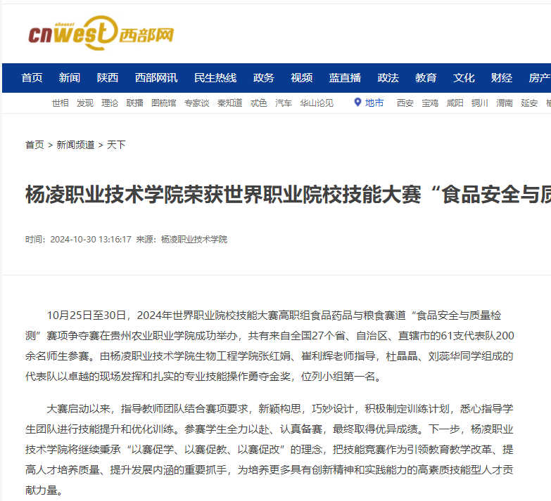 10月25日至30日,2024年世界职业院校技能大赛高职组食品药品与粮食赛道“食品安全与质量检测”赛项争夺赛在贵州农业职业学院成功举办,共有来自全国27个省、自治区、直辖市的61支代表队200余名师生参赛。由杨凌职业技术学院生物工程学院张红娟、崔利辉老师指导,杜晶晶、刘蕊华同学组成的代表队以卓越的现场发挥和扎实的专业技能操作勇夺金奖,位列小组第一名。