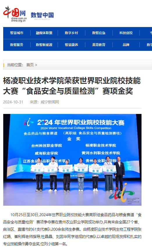 10月25日至30日,2024年世界职业院校技能大赛高职组食品药品与粮食赛道“食品安全与质量检测”赛项争夺赛在贵州农业职业学院成功举办,共有来自全国27个省、自治区、直辖市的61支代表队200余名师生参赛。由杨凌职业技术学院生物工程学院张红娟、崔利辉老师指导,杜晶晶、刘蕊华同学组成的代表队以卓越的现场发挥和扎实的专业技能操作勇夺金奖,位列小组第一名。