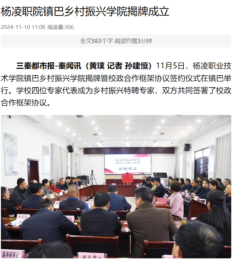 杨凌职业技术学院镇巴乡村振兴学院的成立是校政融合推进全面乡村振兴,践行教育链、人才链、产业链、创新链四链融合助力农业强省建设的务实举措,也是学校扎实践行办好职业教育服务乡村振兴的重要规划。