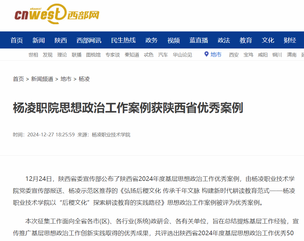 12月24日,陕西省委宣传部公布了陕西省2024年度基层思想政治工作优秀案例,由杨凌职业技术学院党委宣传部报送、杨凌示范区推荐的《弘扬后稷文化 传承千年文脉 构建新时代耕读教育范式——杨凌职业技术学院以“后稷文化”探索耕读教育的实践路径》思想政治工作案例被评为优秀案例。