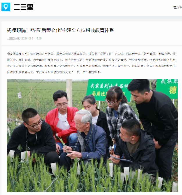 一是成立“后稷书院”,通过探索书院制通识教育实验班、举办文化专题讲座、开展系列后稷文化活动、赋予“后稷精神”新的时代内涵等,给“后稷文化”注入了新的生机。二是建设面积达1000㎡的耕读文化馆,构筑了师生耕读研学基地。三是结合已有的农林综合实训基地建立学生劳动教育基地,每年有计划的组织学生在此进行生产劳动和义务劳动,引导学生以劳树德增智。四是根据陕西自然地理特征,在关中、陕北、陕南三大区域建立了20多个高素质农民培育学院、乡村振兴学院和科技小院,探索了职业教育助力乡村振兴新路径、新模式。
