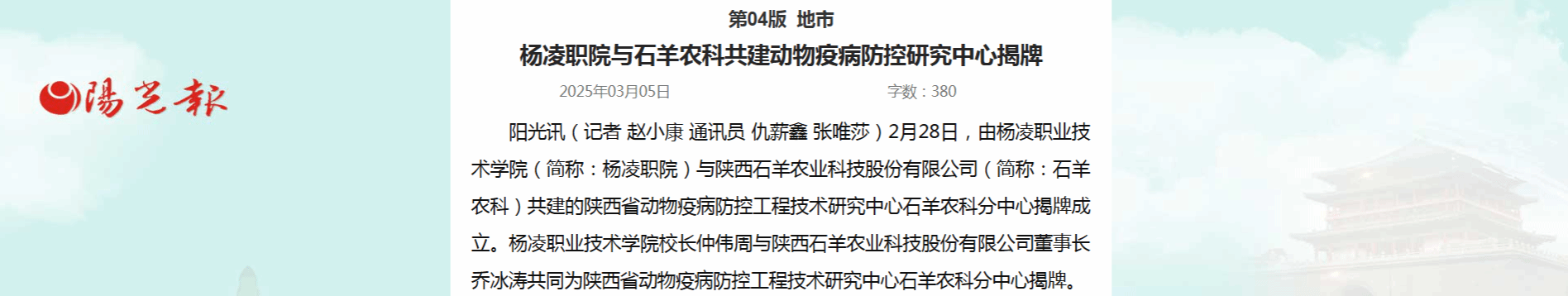 石羊农科分中心的揭牌成立,标志着杨凌职业技术学院与陕西石羊农业科技股份有限公司校企合作迈入全方位、深层次发展的新阶段,也为服务乡村振兴战略、农业职业教育与产业转型升级深度融合提供了创新范式。作为西北地区农牧行业的校企合作典范,该中心将聚焦动物疫病防控技术攻关,强化校企师资双向流动,围绕人才共育、科研协同、平台共建等,在畜牧智能化、疫病防控、绿色养殖等前沿领域深化协同,共绘现代化养殖业新图景,助力畜牧产业提质增效,擘画产教融合新蓝图。