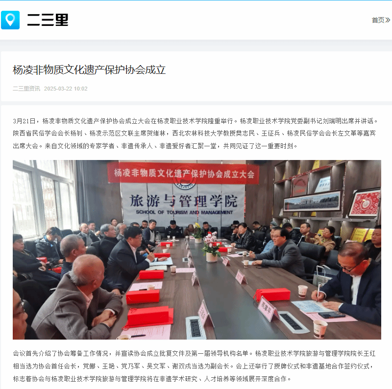 3月21日,杨凌非物质文化遗产保护协会成立大会在杨凌职业技术学院隆重举行。杨凌职业技术学院党委副书记刘瑞明出席并讲话。陕西省民俗学会会长杨钊、杨凌示范区文联主席贺绪林,西北农林科技大学教授樊志民、王征兵、杨凌民俗学会会长左文革等嘉宾出席大会。来自文化领域的专家学者、非遗传承人、非遗爱好者汇聚一堂,共同见证了这一重要时刻。