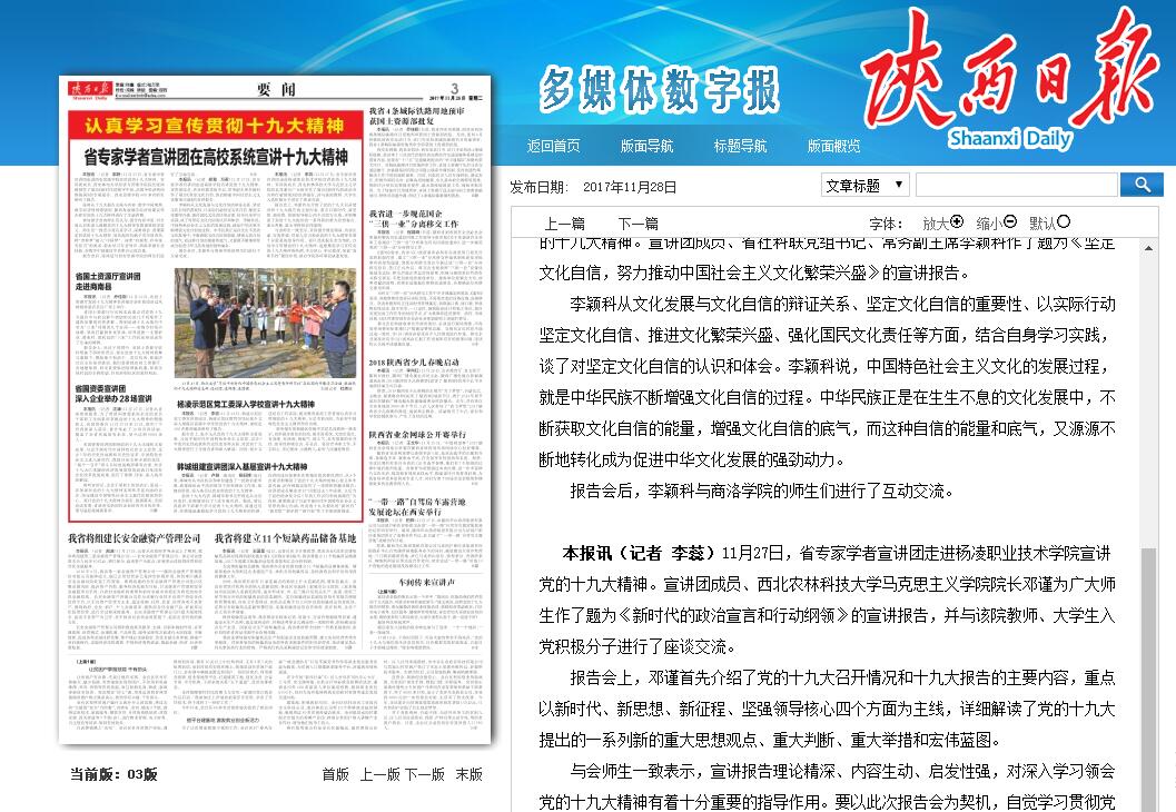 本报讯(记者 李蕊)11月27日,省专家学者宣讲团走进杨凌职业技术学院宣讲党的十九大精神。宣讲团成员、西北农林科技大学马克思主义学院院长邓谨为广大师生作了题为《新时代的政治宣言和行动纲领》的宣讲报告,并与该院教师、大学生入党积极分子进行了座谈交流。
