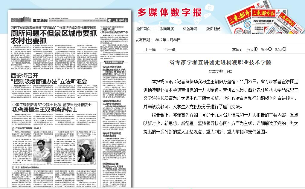 本报杨凌讯(记者薛保华实习生王朝阳孙建恒)11月27日,省专家学者宣讲团走进杨凌职业技术学院宣讲党的十九大精神。宣讲团成员、西北农林科技大学马克思主义学院院长邓谨为广大师生作了题为《新时代的政治宣言和行动纲领》的宣讲报告,并与该院教师、大学生入党积极分子进行了座谈交流。