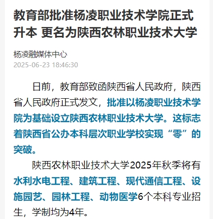 日前,教育部致函陕西省人民政府,陕西省人民政府正式发文,批准以杨凌职业技术学院为基础设立776net必赢官网入口。这标志着陕西省公办本科层次职业学校实现“零”的突破。