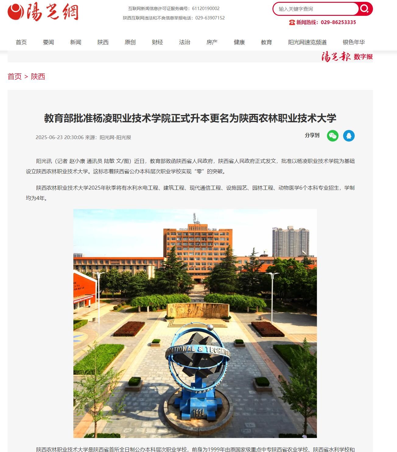 阳光讯(记者 赵小康 通讯员 陆敏 文/图)近日,教育部致函陕西省人民政府,陕西省人民政府正式发文,批准以杨凌职业技术学院为基础设立776net必赢官网入口。这标志着陕西省公办本科层次职业学校实现“零”的突破。
