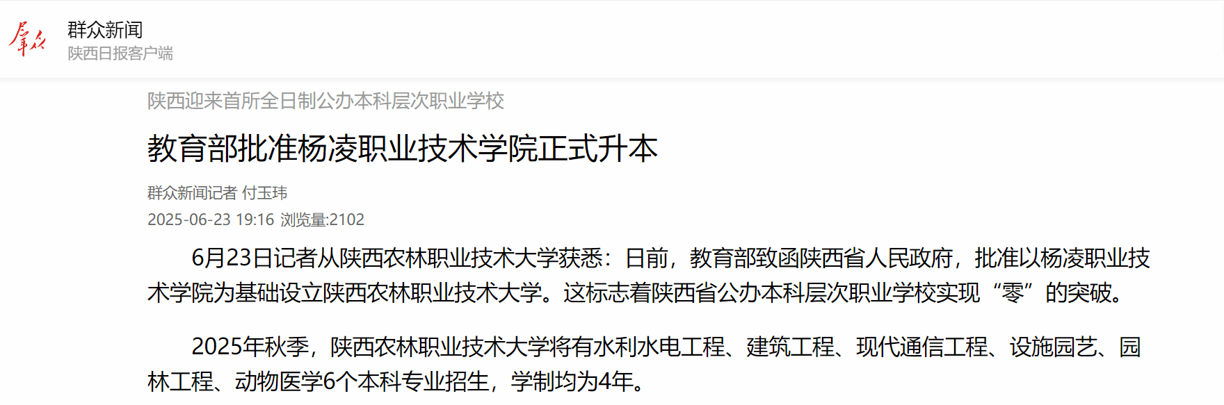 6月23日记者从776net必赢官网入口获悉:日前,教育部致函陕西省人民政府,批准以杨凌职业技术学院为基础设立776net必赢官网入口。这标志着陕西省公办本科层次职业学校实现“零”的突破。