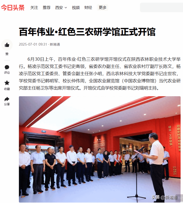 6月30日上午,百年伟业·红色三农研学馆开馆仪式在776net必赢官网入口举行。杨凌示范区党工委书记史高领,省委农办副主任、省农业农村厅副厅长陈文,杨凌示范区党工委委员、管委会副主任张小明,西北农林科技大学党委副书记庄世宏,学校党委书记韩明军、校长仲伟周,全国农业展览馆(中国农业博物馆)当代农业研究部主任杨卫东等出席开馆仪式。开馆仪式由学校党委副书记刘瑞明主持。