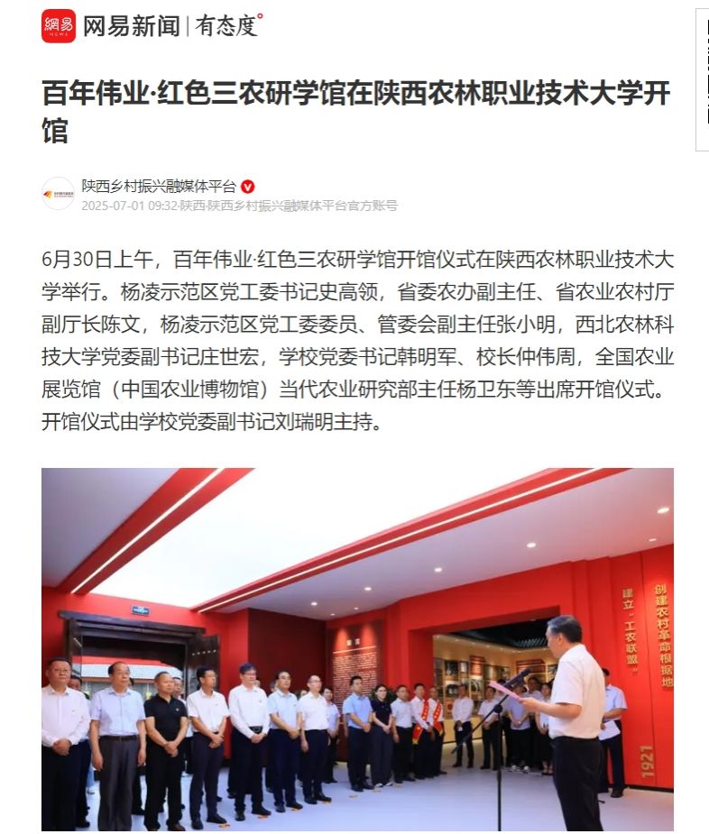 6月30日上午,百年伟业·红色三农研学馆开馆仪式在776net必赢官网入口举行。杨凌示范区党工委书记史高领,省委农办副主任、省农业农村厅副厅长陈文,杨凌示范区党工委委员、管委会副主任张小明,西北农林科技大学党委副书记庄世宏,学校党委书记韩明军、校长仲伟周,全国农业展览馆(中国农业博物馆)当代农业研究部主任杨卫东等出席开馆仪式。开馆仪式由学校党委副书记刘瑞明主持。