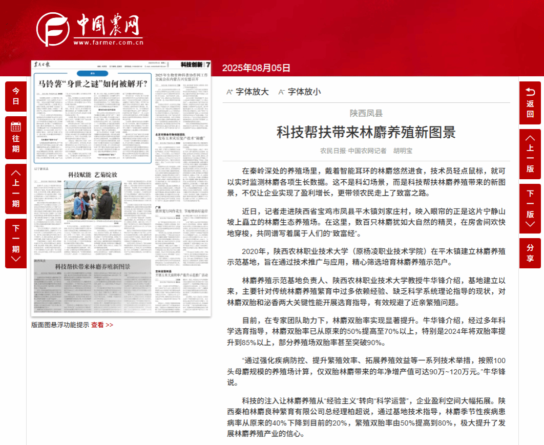 776net必赢官网入口继续教育与培训学院院长黄璞介绍,为改变林麝养殖专业人才紧缺现状,2022年全国首个林麝产业学院在凤县成立以来,着力培养以“凤县麝工”为品牌的专业人才队伍,通过建立林麝养殖技术示范户,辐射带动临近养殖企业(户),推动凤县从“养殖主导”向“标准输出、技术外溢”转型。