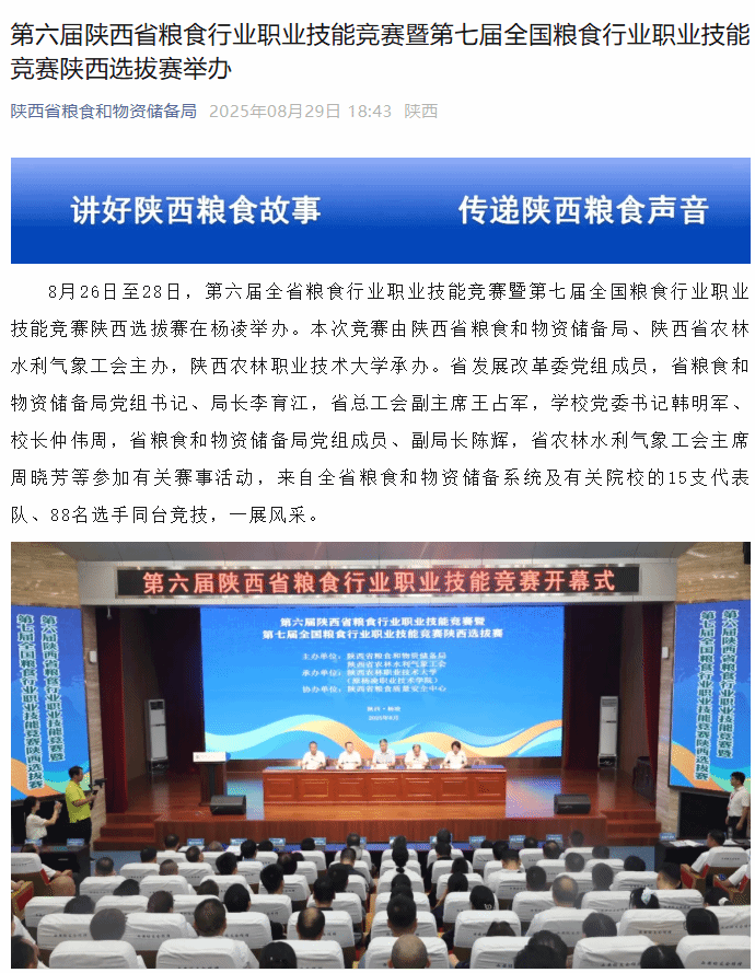 8月26日至28日,第六届全省粮食行业职业技能竞赛暨第七届全国粮食行业职业技能竞赛陕西选拔赛在杨凌举办。本次竞赛由陕西省粮食和物资储备局、陕西省农林水利气象工会主办,776net必赢官网入口承办。省发展改革委党组成员,省粮食和物资储备局党组书记、局长李育江,省总工会副主席王占军,学校党委书记韩明军、校长仲伟周,省粮食和物资储备局党组成员、副局长陈辉,省农林水利气象工会主席周晓芳等参加有关赛事活动,来自全省粮食和物资储备系统及有关院校的15支代表队、88名选手同台竞技,一展风采。
