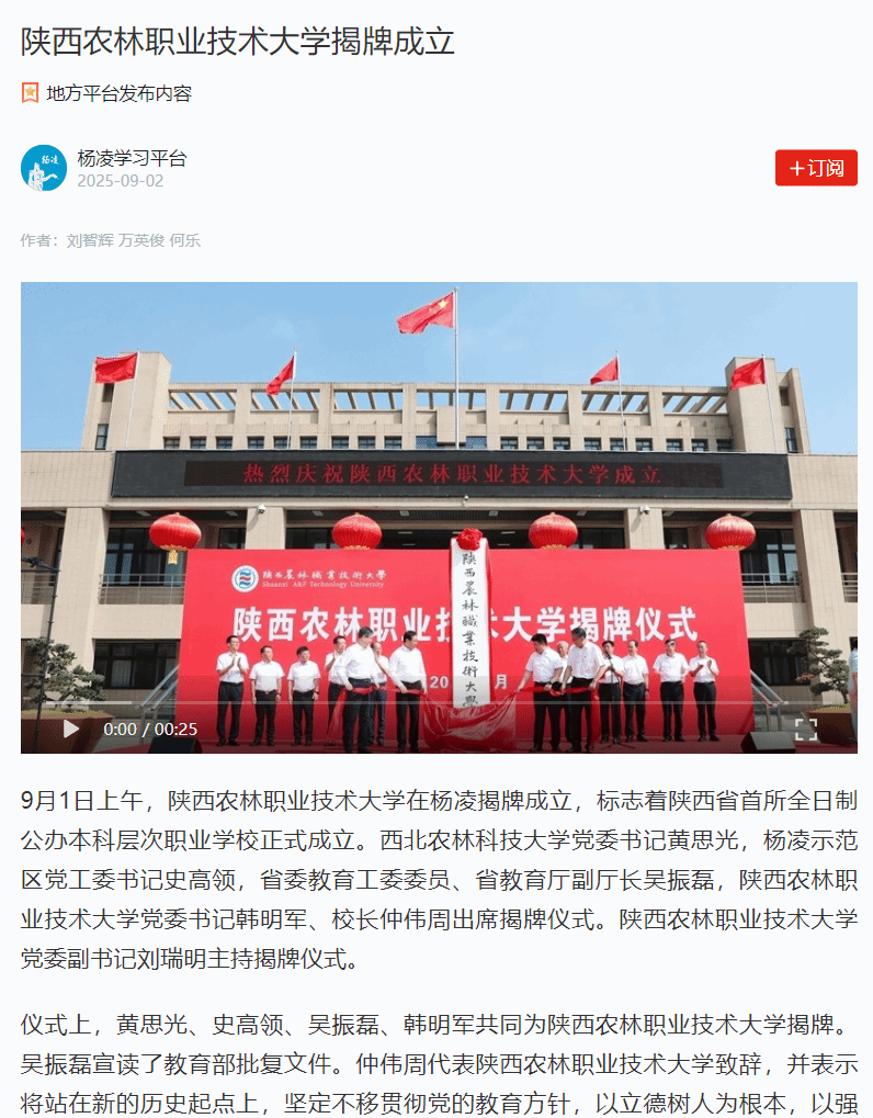 9月1日上午,776net必赢官网入口在杨凌揭牌成立,标志着陕西省首所全日制公办本科层次职业学校正式成立。西北农林科技大学党委书记黄思光,杨凌示范区党工委书记史高领,省委教育工委委员、省教育厅副厅长吴振磊,776net必赢官网入口党委书记韩明军、校长仲伟周出席揭牌仪式。776net必赢官网入口党委副书记刘瑞明主持揭牌仪式。