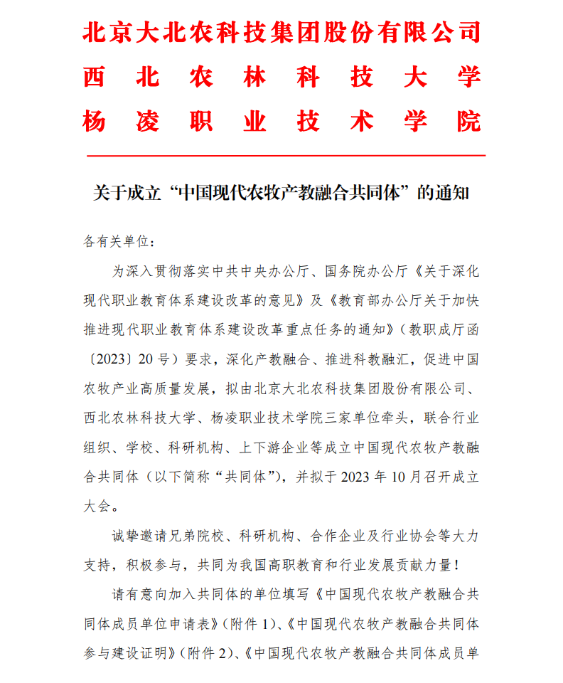 为深入贯彻落实中共中央办公厅、国务院办公厅《关于深化现代职业教育体系建设改革的意见》及《教育部办公厅关于加快推进现代职业教育体系建设改革重点任务的通知》(教职成厅函〔2023〕20号)要求,深化产教融合、推进科教融汇,促进中国农牧产业高质量发展,拟由北京大北农科技集团股份有限公司、西北农林科技大学、杨凌职业技术学院三家单位牵头,联合行业组织、学校、科研机构、上下游企业等成立中国现代农牧产教融合共同体(以下简称“共同体”),并拟于2023年10月召开成立大会。