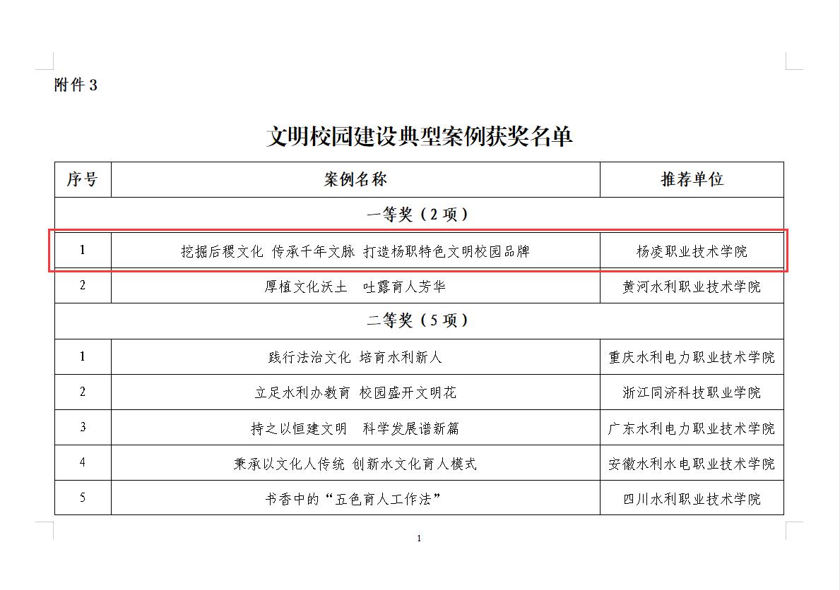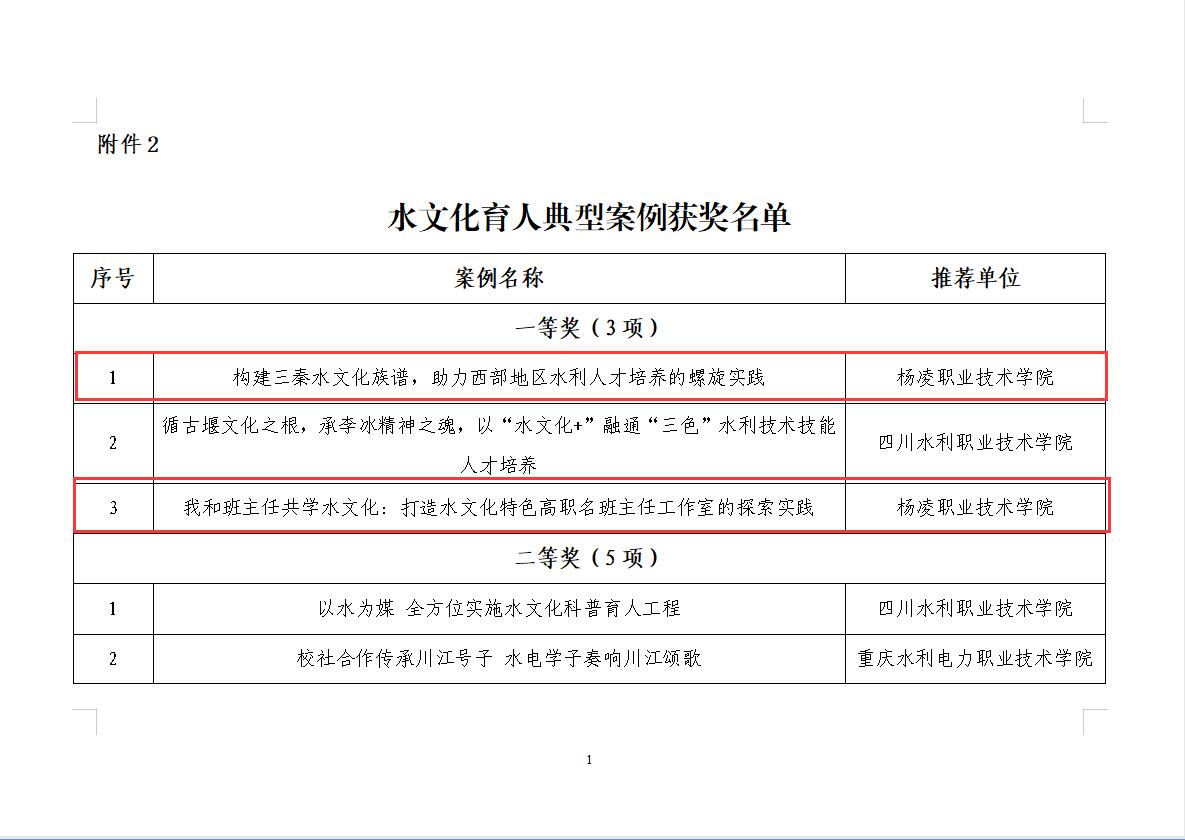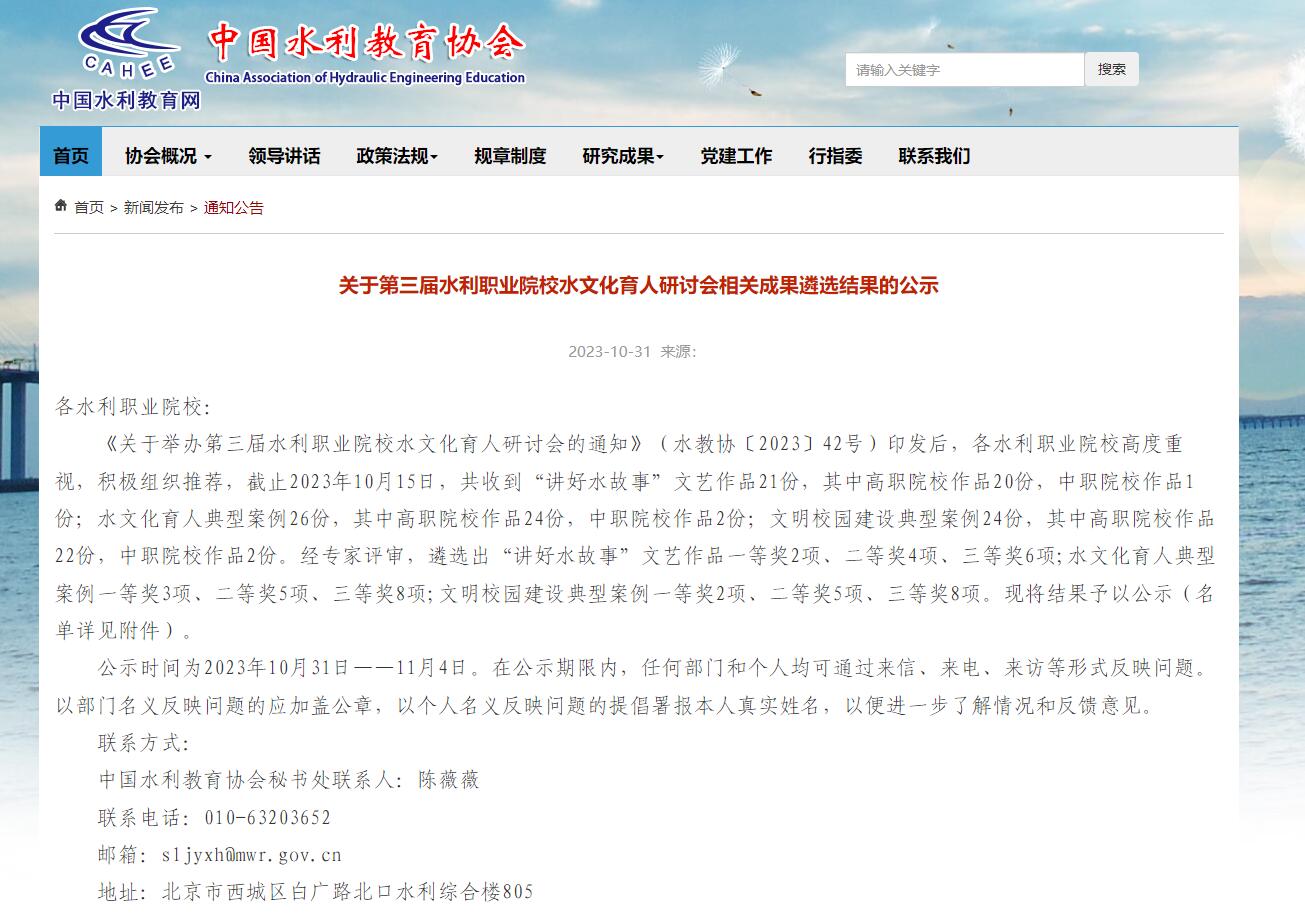 10月31日,中国水利教育协会公布了第三届水利职业院校水文化育人研讨会相关成果评选结果。由杨凌职业技术学院水利工程学院报送的《构建三秦水文化族谱,助力西部地区水利人才培养的螺旋实践》和《我和班主任共学水文化:打造水文化特色高职名班主任工作室的探索实践》2个案例获水文化育人典型案例一等奖;党委宣传部报送的《挖掘后稷文化 传承千年文脉 打造杨职特色文明校园品牌》案例获文明校园建设典型案例一等奖。