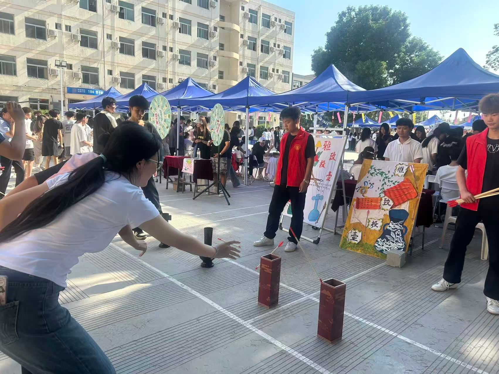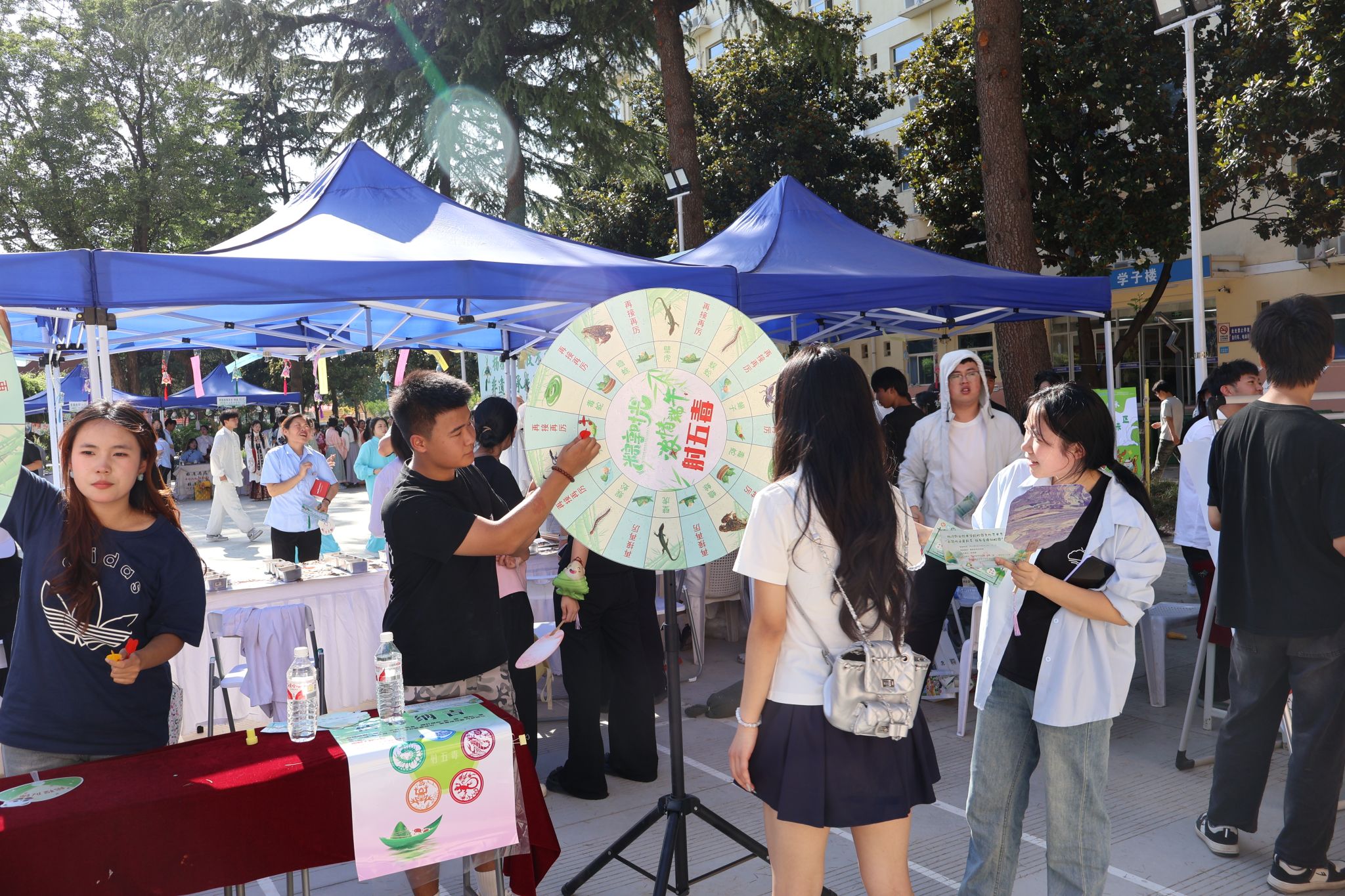 “拾趣端午”游园会活动区设置了 10个特色关卡。“本草探秘”关卡考验中药辨识能力,“竞渡先锋”旱地龙舟赛妙趣横生,大家齐心协力参与其中;“雅致投壶”重现古人的礼仪之雅。活动现场欢声笑语不断,同学们积极闯关解锁,通过集章打卡获得“非遗传承”纪念品,沉浸式体验端午文化的独特魅力。