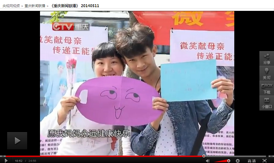 传递爱与正能量,我们一直在行动。我院曾经开展“筝”爱你我等一系列关心母亲,传递正能量的活动,受到外界一致好评。本次精彩纷呈的活动,向国人传递了以爱和微笑为主题、关爱母亲的正能量,更是受到了重庆电视台、重庆市沙坪坝区电视台、华龙网等新闻媒体的热烈关注。我院将与爱同行,携手志愿者,关爱母亲,关爱家人,让爱永存。也祝愿所有的母亲节日快乐、健康美丽!