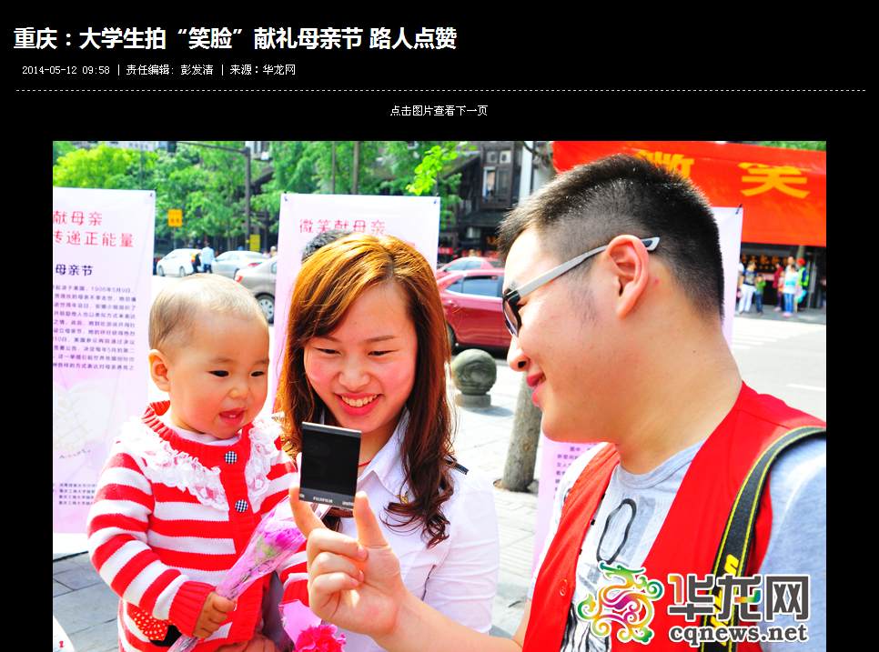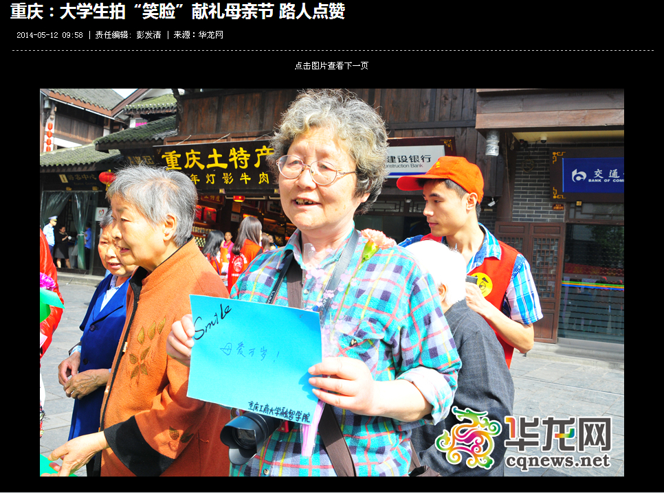 (通讯员 杨韵琦洪韵秋)2014年5月11日上午9:00,由共青团重庆市沙坪坝区委员会主办,我院党员服务站承办、青年志愿者协会与新闻中心协办的“微笑送母亲,传递正能量”活动在古香古色的磁器口正街广场正式启动。