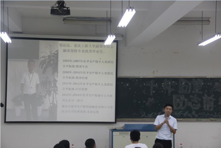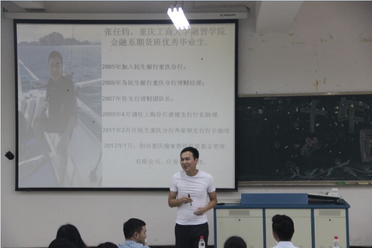 (通讯员朱琳)为了让我院在校生充分了解当今社会的人才需求,给自己一个正确的定位,我院金融系于2015年6月17日晚19点在10303教室举行优秀毕业生事迹报告会。金融系党总支副书记唐川川,金融系办公室主任李喆,2005届优秀毕业生张任钧(现任重庆瀚亚股权投资基金管理有限公司董事总经理)、邹远远(现任中国平安产险保险股份有限公司重庆分公司代理渠道总监)应邀出席本次报告会。