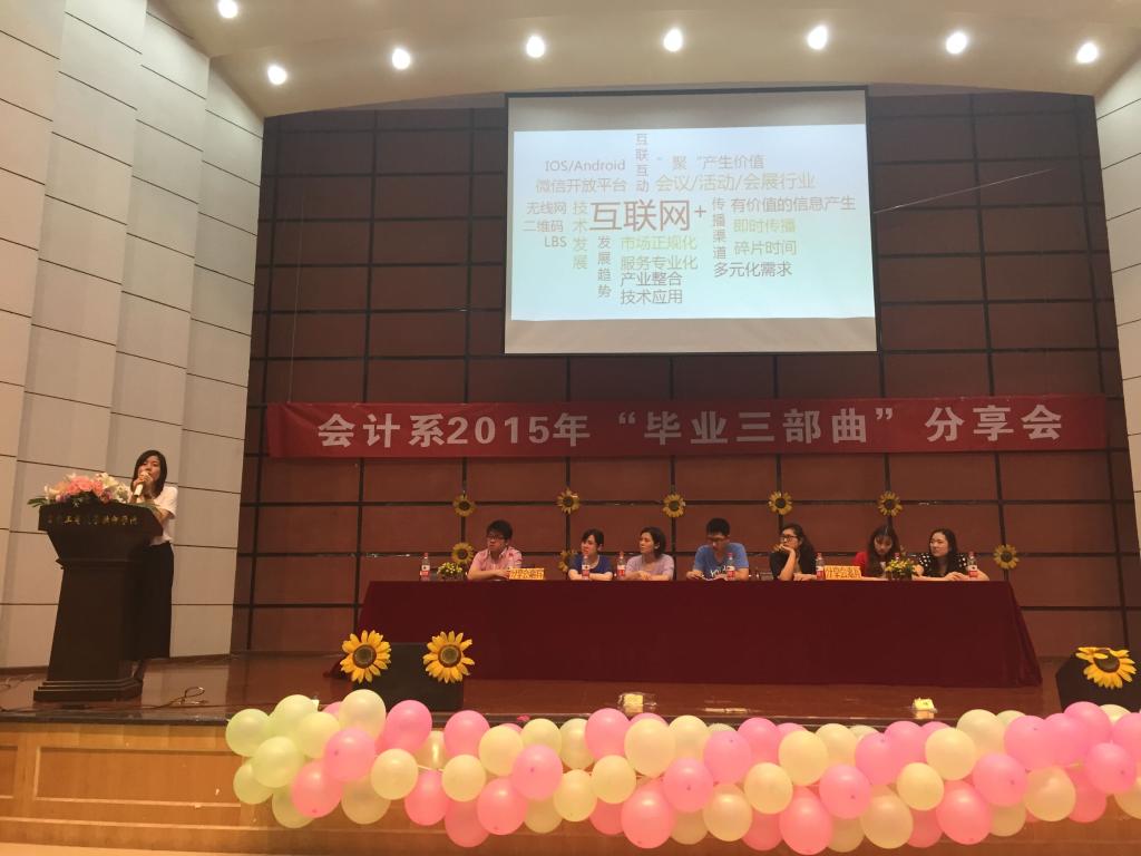 (通讯员 李慕华 王群灵)2015年5月7日晚上会计系2015年毕业季“毕业三部曲”分享会在学术报告厅顺利举行。本次分享会邀请到了会计系往届毕业生上海龙德网络科技有限公司市场总监黄榆婷、重庆银行客户经理韦怡、重庆高新区国税局任俊、重庆市报废汽车(集团)有限公司刘清兵以及应届毕业生罗颖雨、张璐、卢悦、陈雯雯共8位同学作为分享团成员。本次分享会的到场嘉宾有会计系党总支副书记陈萍,会计系学团办主任李兰及会计系专职辅导员唐凤芬、吴琳、谭白冰、游登贵。