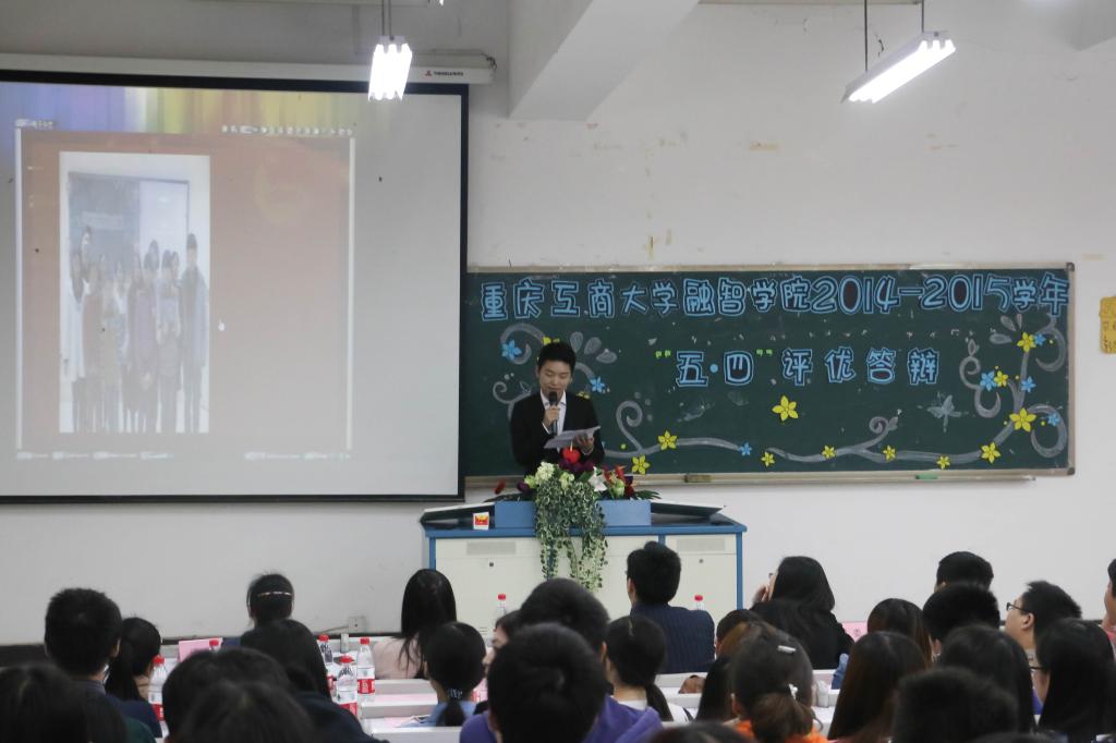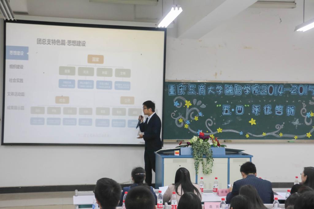 (学生记者:胡瑶 周勇)弘扬五四精神,点燃青春梦想。2015年4月24日12:10,我院2014-2015学年“五.四”评优答辩会在10303教室顺利举行。学生处副处长姚转花、教务处副处长周雄、党政办副主任甘雪梅、党群工作部群团科副科长钟定华、团委副书记李刚担任评委,金融系学团办主任于成江、管理工程系学团办主任王玲艳、信息工程系学团办主任乐晓勇、经济系学团办副主任肖婵、商务系学团办副主任张斌、团委干事马凌凤以及各系团总支学生会、社团联合会、大学生艺术团、大学生自我服务与管理委员会、党员服务站和新闻中心主席团应邀出席。